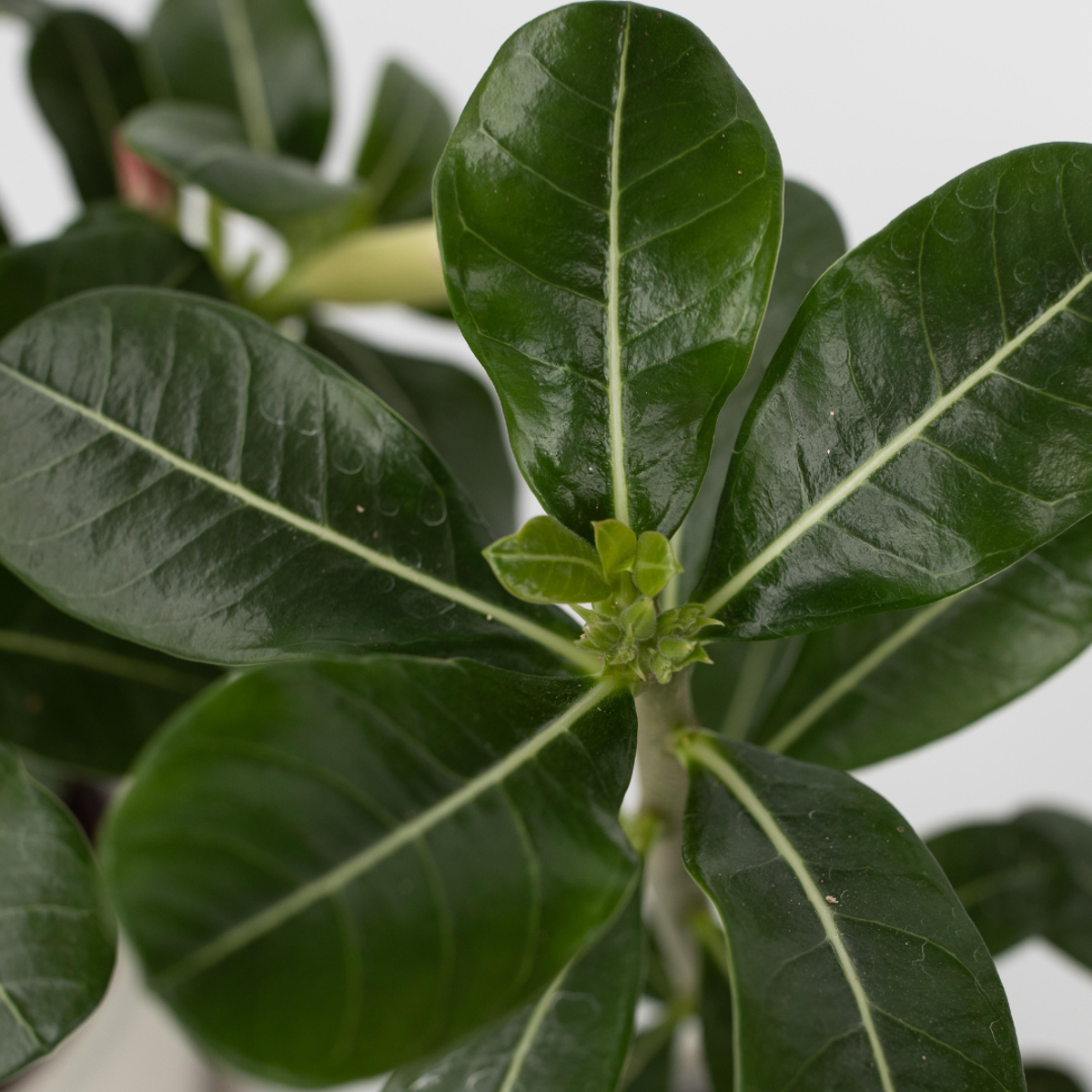 De Adenium, beter bekend als de woestijnroos, is een bijzonder mooie plant. Zoals de naam al zegt, is hij afkomstig uit de droge delen van de woestijn in Oost- en Noordoost-Afrika. Daar kan de Adenium wel 5 meter hoog worden met een prachtige kale stam. Gelukkig wordt de plant thuis niet zo hoog. Opvallend aan de Adenium zijn de prachtige roze bloemen, frisse groene bladeren en de grillige vorm van de stam.