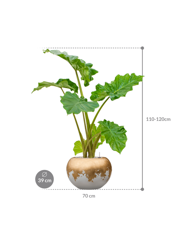 De Alocasia komt kant-en-klaar in een hoogwaardige Baq Luxe Lite Glossy pot, die niet alleen de uitstraling versterkt, maar ook is voorzien van een innovatief beplantingsysteem. De pot is afgevuld met Vulkastrat, een materiaal dat meer water absorbeert dan gewone aarde en het geleidelijk aan de wortels afgeeft. Zo blijft de plant optimaal gehydrateerd en wordt overbewatering voorkomen. Daarnaast is de pot uitgerust met een watermeter voor een handige controle van de waterbehoefte van de plant.