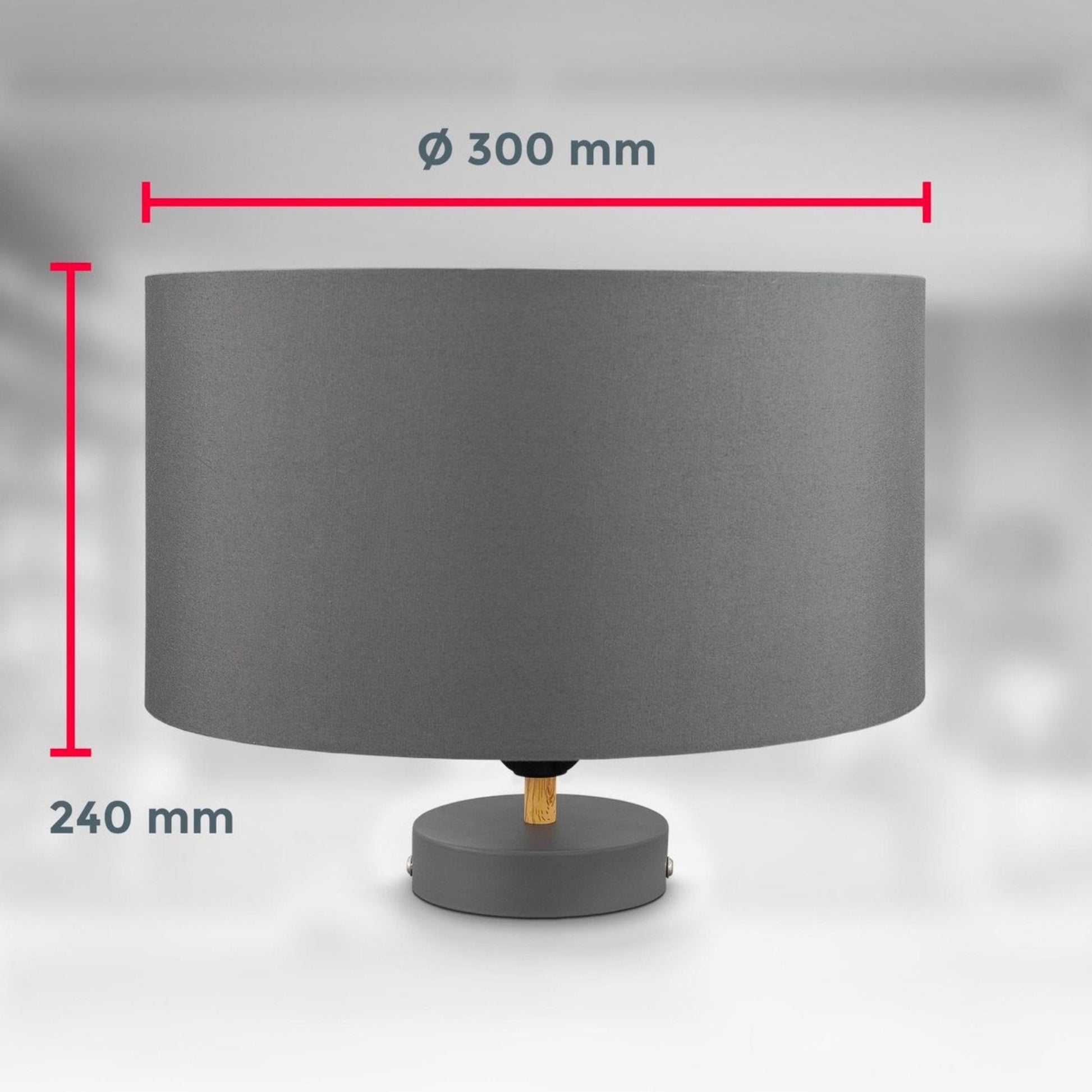 De decoratieve, trendy stoffen lamp heeft een diameter van 300 mm en een totale lengte van 240 mm. De stofkap heeft een hoogte van 160 mm. De luifel van metaal in mat-grijs met houten afwerking bedekt je bestaande stroomaansluiting tot een diameter van 100 mm.