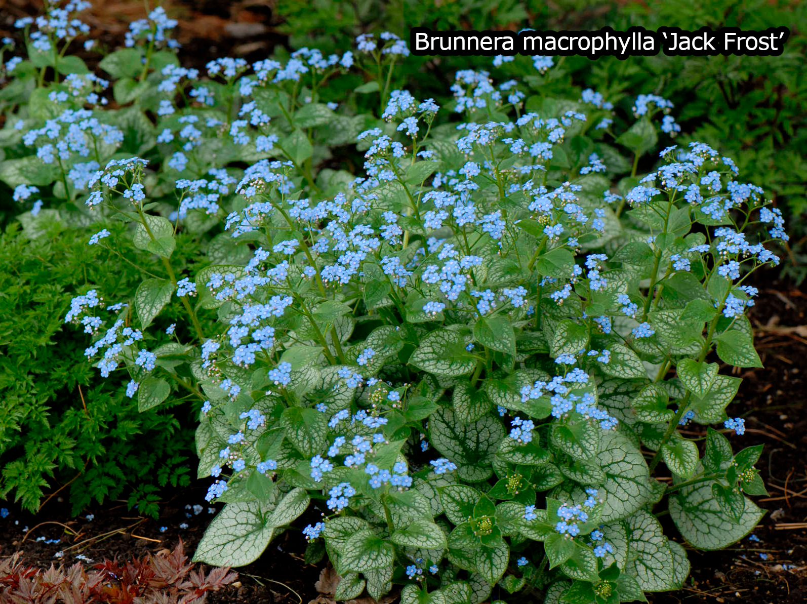 Brunnera macrophylla ‘Jack Frost’: Hartvormig zilvergrijs blad met blauwe bloei in het voorjaar.