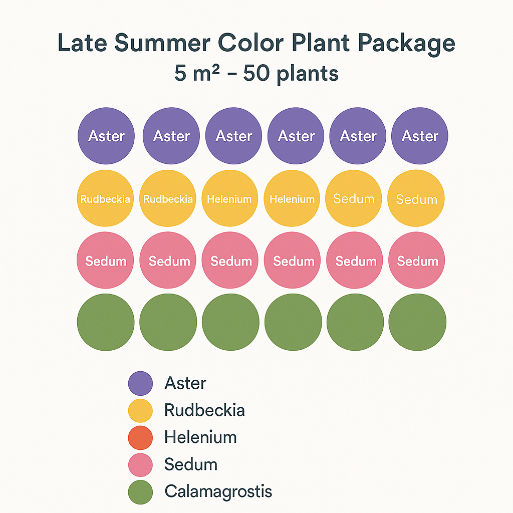 Breng leven en kleur in je tuin wanneer veel andere planten al zijn uitgebloeid! Met dit nazomer-borderpakket geniet je van een uitbundige bloei vanaf augustus tot ver in oktober. Dit zorgvuldig samengestelde pakket is ideaal voor een levendige border vol late bloeiers en siergrassen. Het bevat 50 sterke planten in P11 potten, geschikt voor een border van circa 5 vierkante meter.