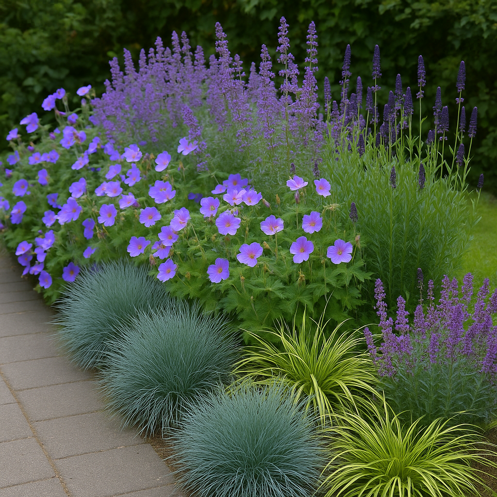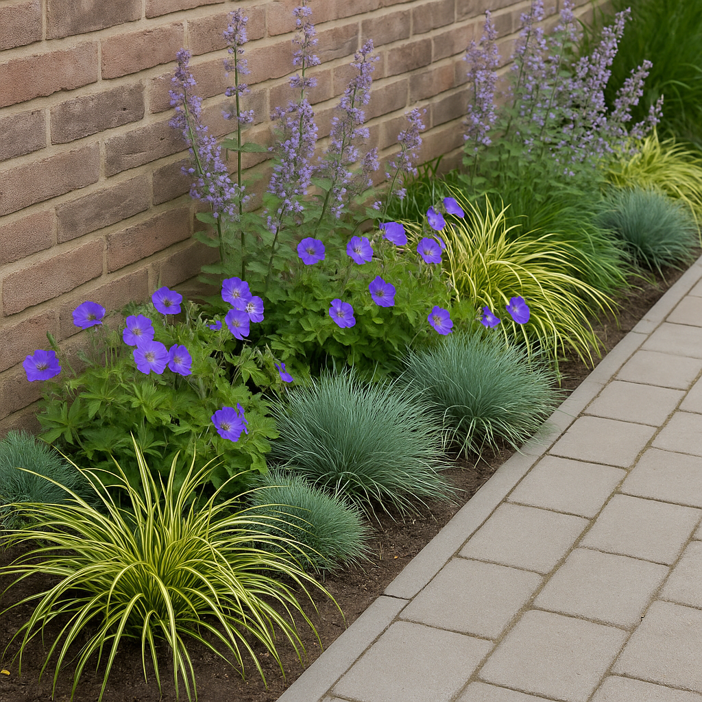 Met dit borderpakket creëer je een stijlvolle, onderhoudsarme border met jaarrond sierwaarde. De combinatie van siergrassen en sterke vaste planten zorgt voor structuur, kleur en een lange bloeiperiode, terwijl het onderhoud minimaal blijft. Perfect voor smalle borders langs paden, schuttingen of muren.