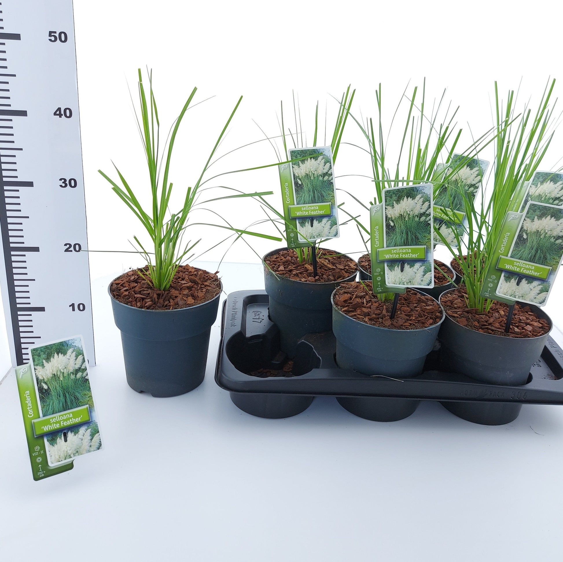 De Cortaderia selloana 'White Feather', beter bekend als witte pampasgras, is een sierlijk en opvallend siergras dat elk tuinontwerp verrijkt. Dit elegante siergras staat bekend om zijn spectaculaire witte pluimen die in de late zomer en herfst boven het smalle, groenblijvende blad uitsteken. De pluimen wuiven sierlijk in de wind en blijven tot diep in de winter een decoratief element in de tuin. Pampasgras is een uitstekende keuze voor zowel moderne als klassieke tuinen en kan als solitair, in groepen of als natuurlijke afscheiding worden toegepast. Dit siergras wordt geleverd in P9, C2 of C5 pot. Hoe groter de pot, hoe groter de kluit, hoe groter de plant uiteindelijk kan worden.