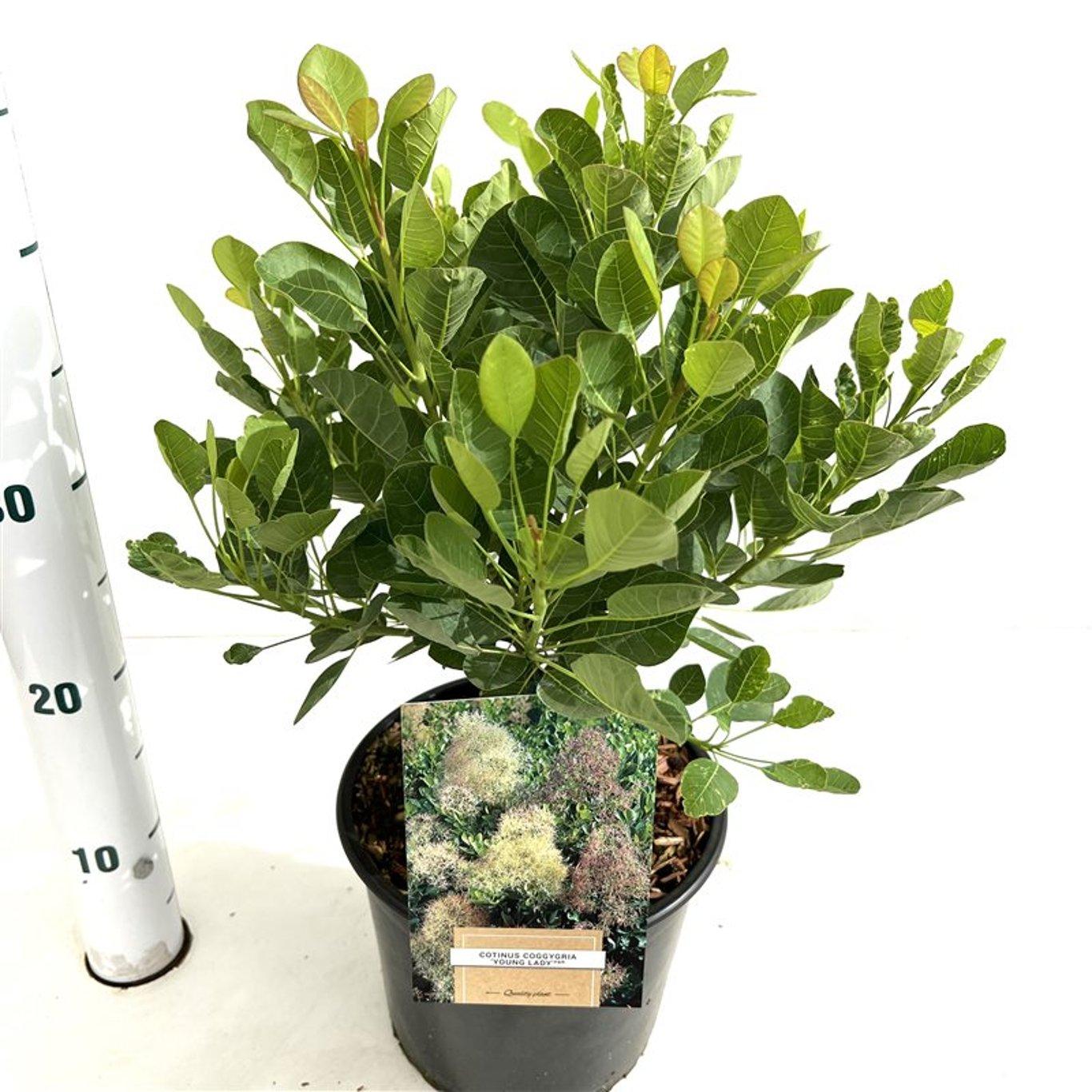 Het blad is frisgroen en verkleurt in de herfst naar prachtige tinten oranje, rood en geel, waardoor de 'Young Lady' ook in het najaar een blikvanger is. Met een hoogte van 150 – 200 cm blijft deze cultivar een stuk kleiner dan de klassieke Cotinus, wat hem ideaal maakt voor kleinere tuinen, borders of als solitair.