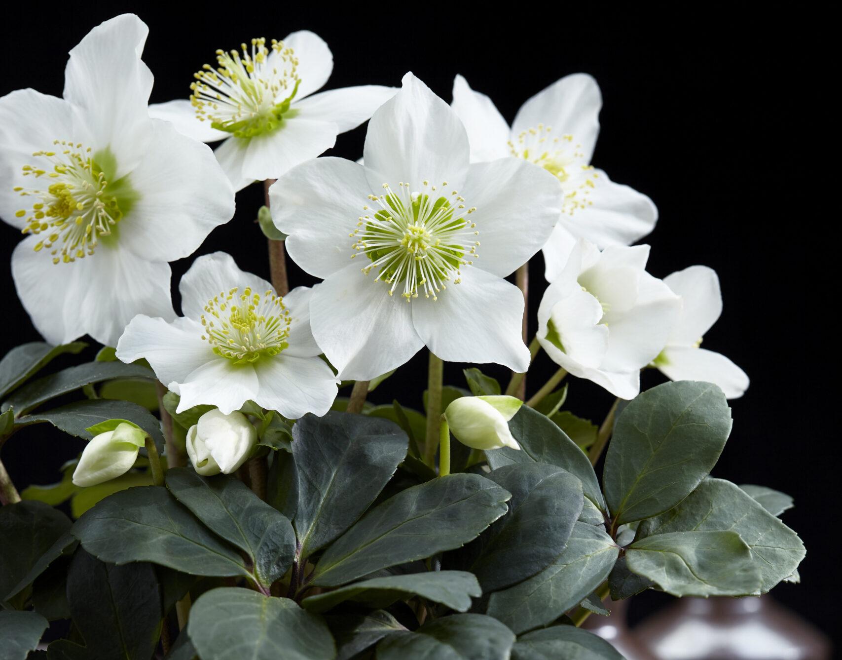 De Helleborus 'Niger' bloeit van december tot februari, en is daarmee een van de eerste planten die de tuin opfleurt in de wintermaanden. De bloemen beginnen als zachte witte knoppen en openen zich naar pure, witte bloemen met een subtiele gele kern.