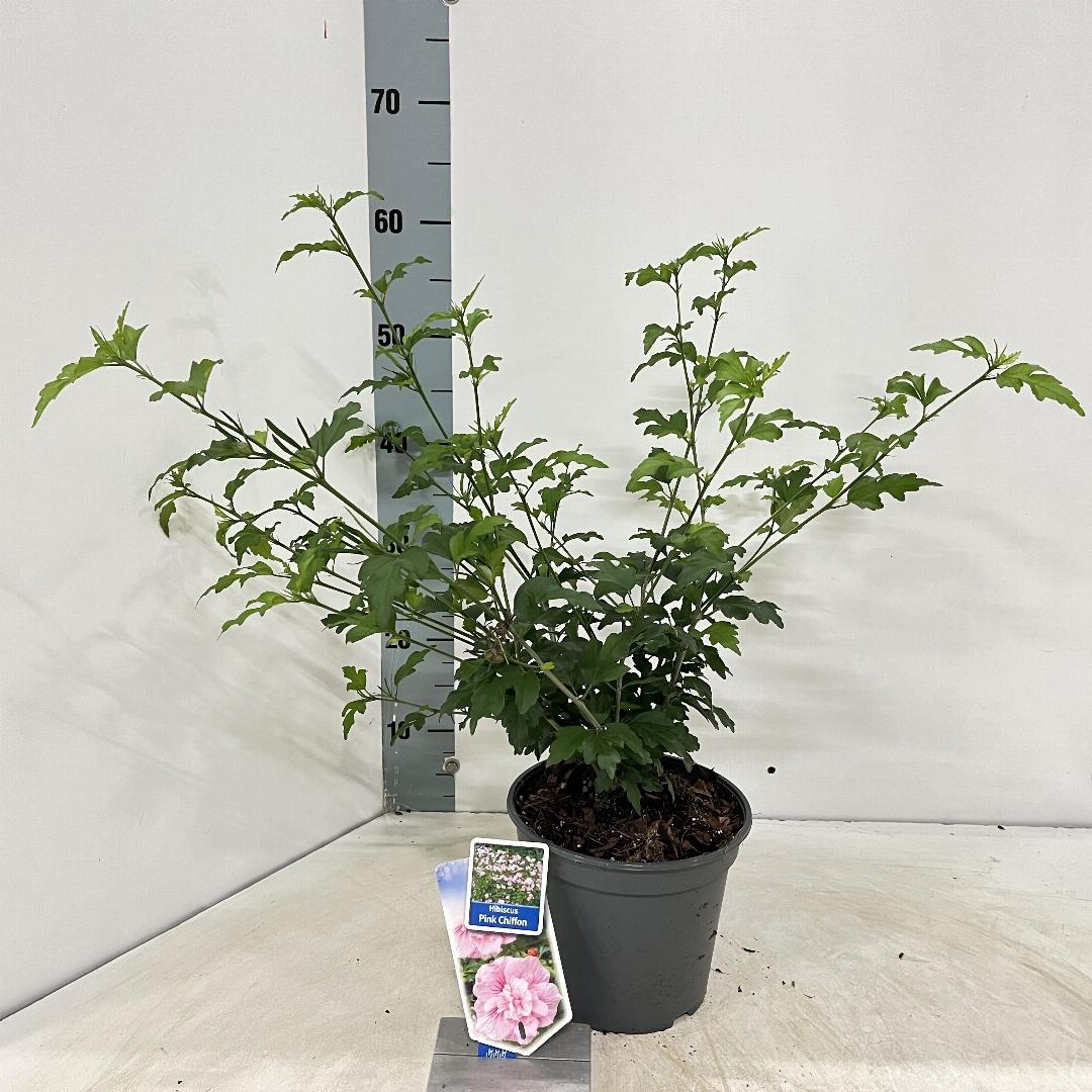 De Hibiscus syriacus 'Pink Chiffon' is een prachtige heester met grote, gevulde zachtroze bloemen die een romantische uitstraling aan de tuin geven. De bloemblaadjes hebben een subtiele, licht golvende structuur en een dieper roze hart, wat deze hibiscus extra sierlijk maakt. Van juli tot september bloeit hij uitbundig en trekt hij vlinders en bijen aan. Een perfecte keuze voor borders, hagen of als solitair in de tuin.