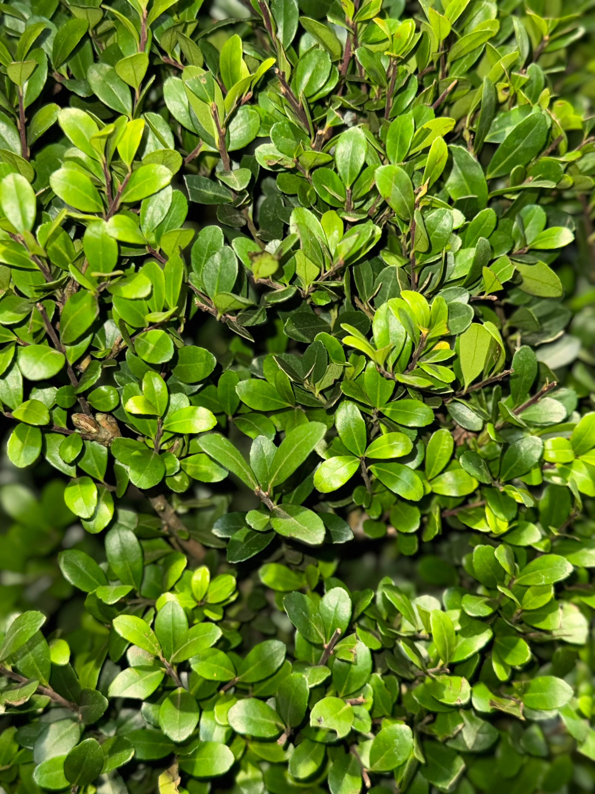 Blad: Het blad is klein, ovaal en glanzend donkergroen. De bladeren blijven het hele jaar door aan de plant en behouden hun frisse uitstraling, zelfs in de winter.