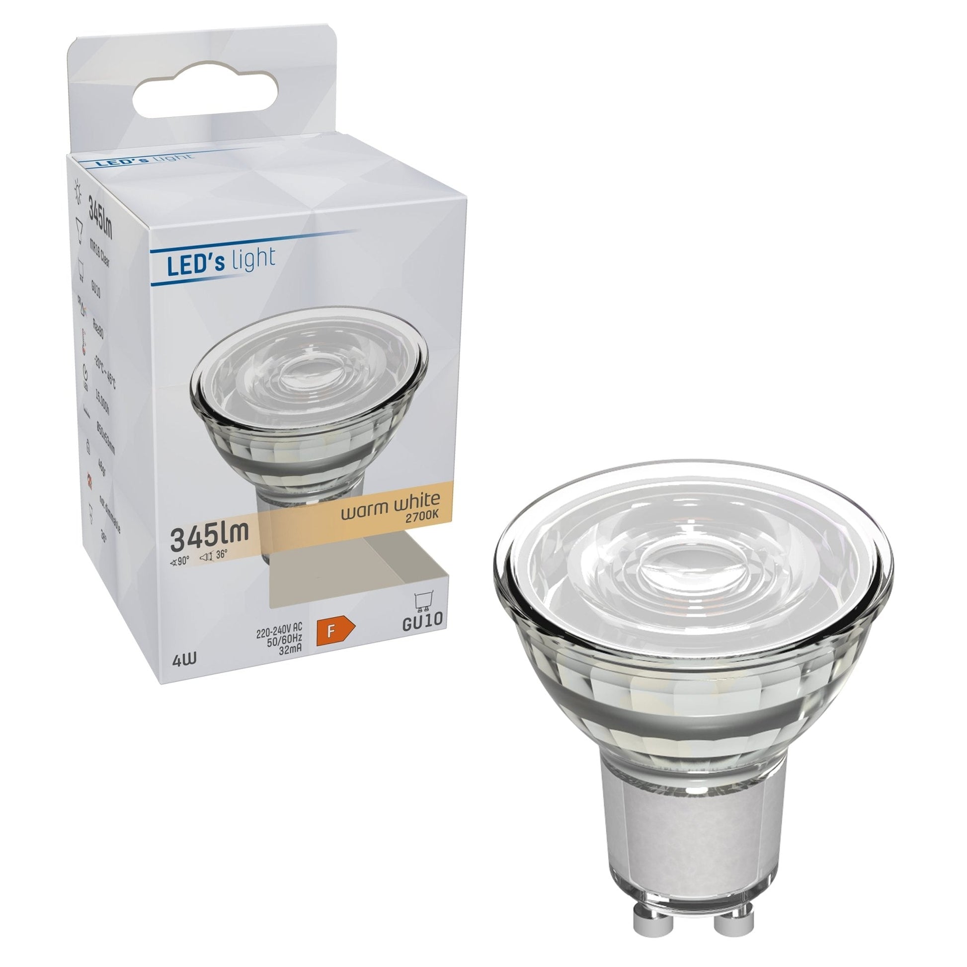 - Verpakkingsinhoud: 3 x LED Spot met GU10 fitting - Transparant glas - Ø 5 cm - 345 lumen - 4W (50W) - Warm wit licht (2700 K)
