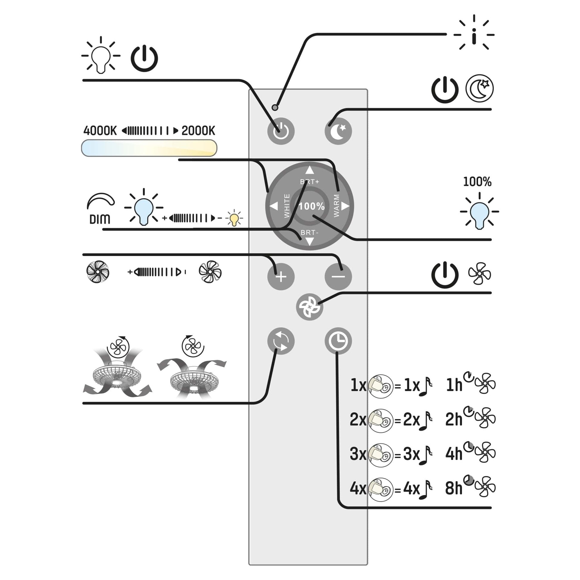 Bij de Silencio plafondlamp ventilator zit een handige afstandsbediening waarmee je tal van functies bedient. Zo kun je de lichtkleur aanpassen van neutraal wit (4000K) naar extra warm wit (2000K). Ook de lichtsterkte is traploos te dimmen voor de perfecte sfeer. Bovendien beschikt de plafondlamp over een timerfunctie waarmee je de verlichting of ventilatie na een bepaalde tijd automatisch kunt in- of uitschakelen. Ideaal als je de ventilator niet de hele nacht aan wil laten staan, maar wel in slaap wil vallen met een verkoelend briesje.