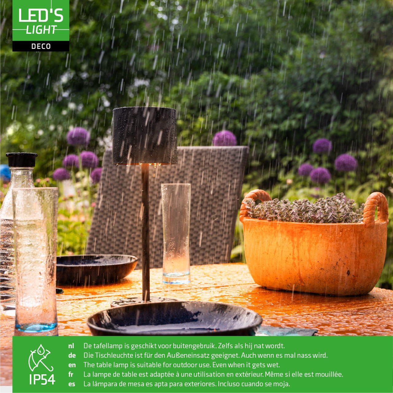 Deze handige tafellamp is echt overal op zijn plek, binnen of buiten. Hij is speciaal gemaakt om tegen een stootje te kunnen; stof en spatwater doen hem niks, dankzij zijn IP54-classificatie. Dus of je nu een lampje nodig hebt voor op de camping, je patio, balkon of in de tuin, deze lamp kan het aan.