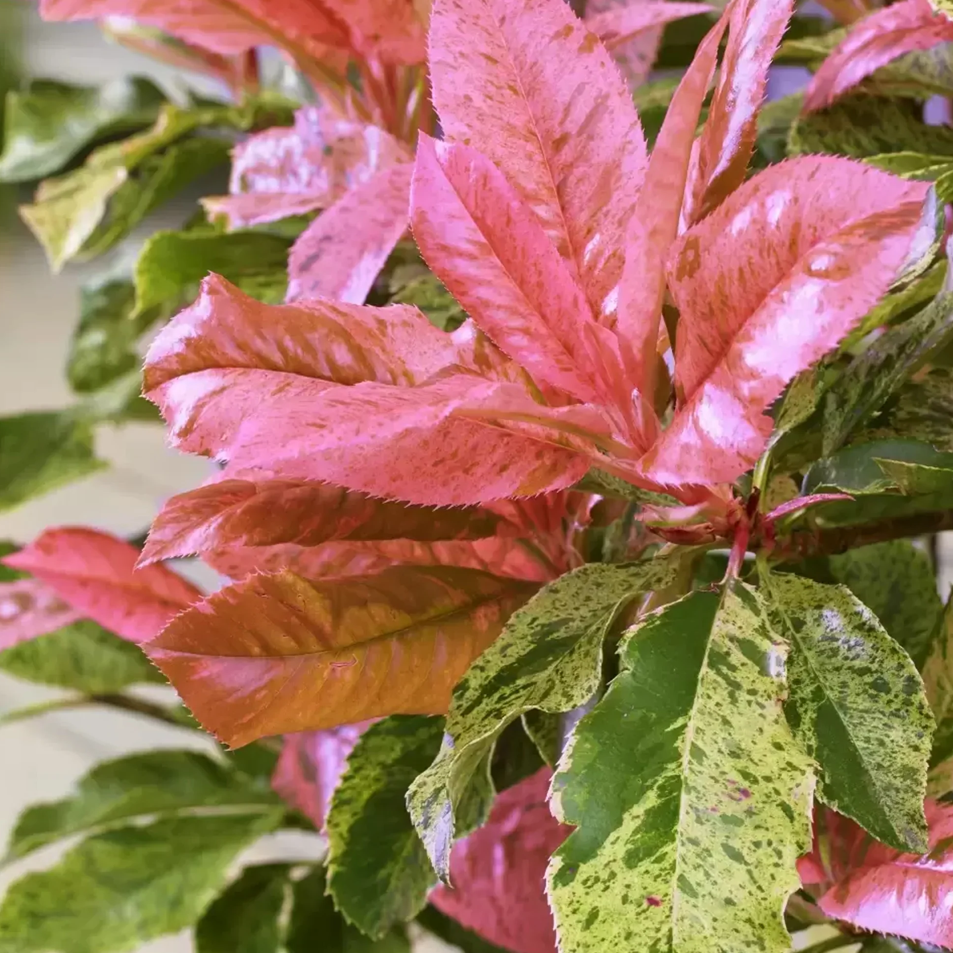 De Photinia serratifolia 'Pink Crispy' is een unieke en opvallende sierheester die direct de aandacht trekt met zijn bont gekartelde blad en roze uitlopers. Waar de bekende Photinia ‘Red Robin’ rood jong blad geeft, verrast deze variant met lichtroze scheuten die prachtig afsteken tegen het roomwit gevlekte blad. Dankzij de compacte groei en het wintergroene karakter is deze plant ideaal voor een kleurrijke haag, als solitair of in een moderne border.